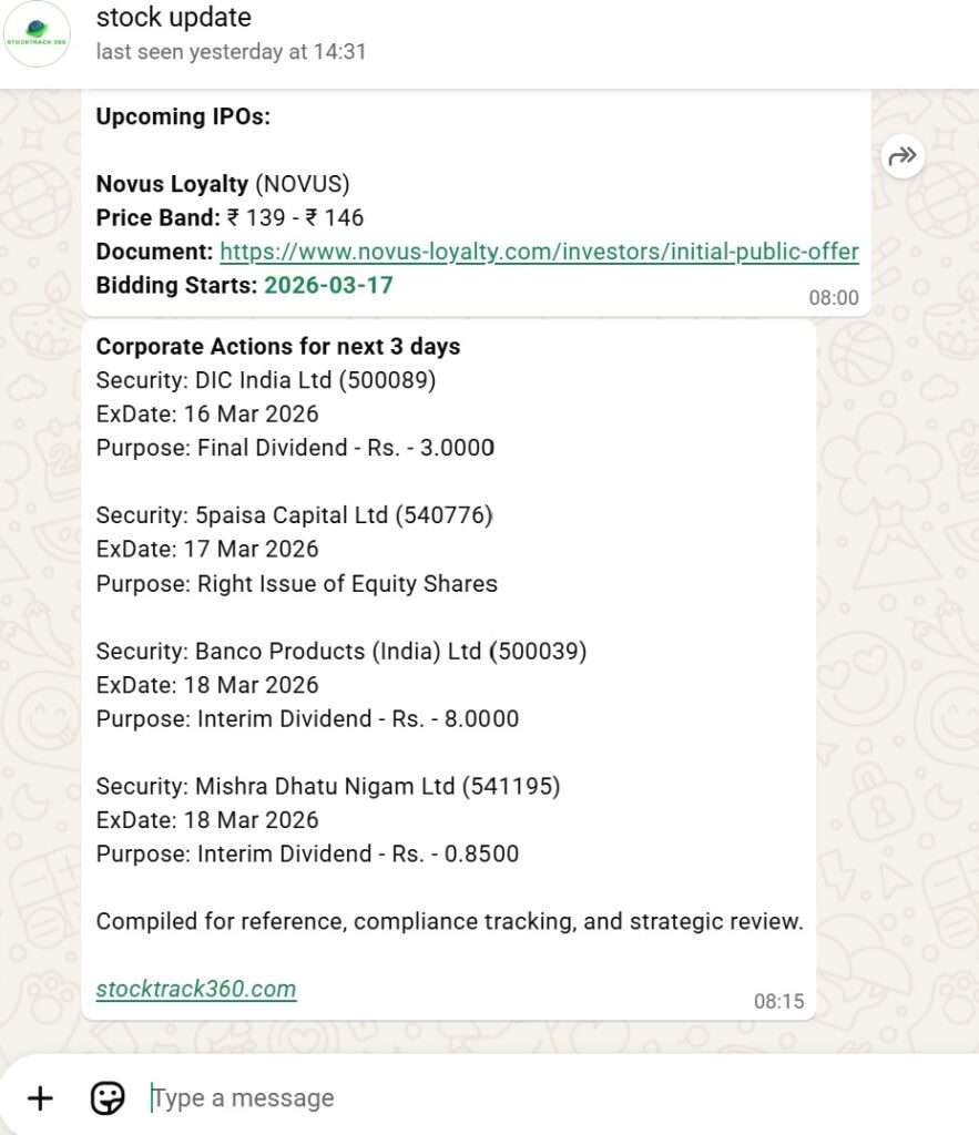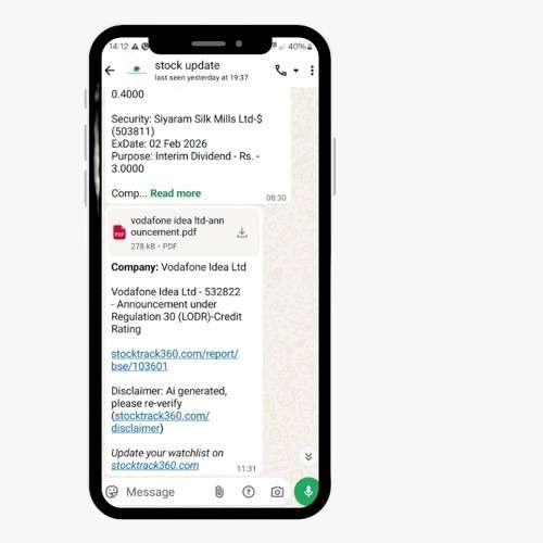 Designed for investors, traders, research analysts and portfolio managers, Stock Track 360 converts complex and lengthy disclosures into crisp, easy-to-understand alerts. With features such as instant WhatsApp notifications, smart filtering, and structured updates, it eliminates noise and highlights only the most relevant information.